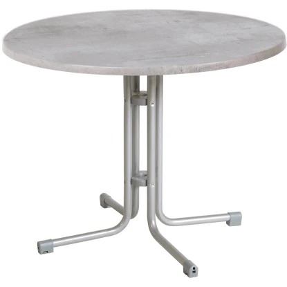 Platzsparend komplett abklappbar. Das Untergestell besteht aus wetterfest pulverbeschichtetem Stahlrohr, die Tischplatte aus robustem Topalit. Die Tischplatte ist randlos. Inkl. Höhenausgleich.