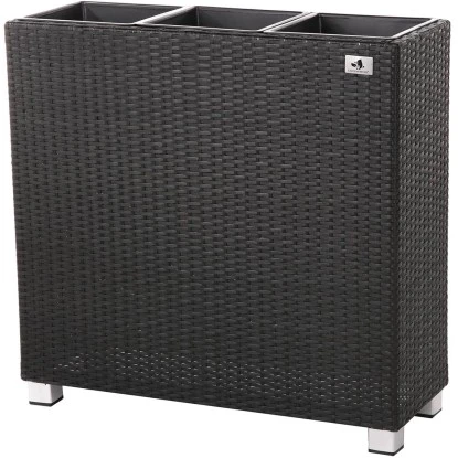 Der Pflanzkübel Polyrattan ist ein Pflanzgefäß für den Innen- und Außenbereich und setzt dekorative Akzente im Haus, auf der Terrasse oder im Garten. Das Pflanzgefäß ist aus einem hochwertigen PE-Kunststoffgeflecht hergestellt, das über einen rostbeständigen Alu-Rahmen gewebt ist. Die Faser ist UV- und temperaturbeständig, langlebig und pflegeleicht. Der Kunststoffeinsatz kann bequem außerhalb des Gefäßes bepflanzt und dann eingesetzt werden und bietet mit einer Größe von 24 cm x 24 cm 24,5 cm ausreichend Platz. Gegenüber Einsätzen aus anderen Materialien bietet dieser den Vorteil, nicht zu rosten und absolut wasserdicht zu sein. Bei Außenaufstellung einfach ein Loch in den Boden bohren, um Staunässe zu vermeiden. Das Pflanzgefäß ist mit dekorativen Aluminium-Füßen versehen.