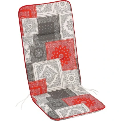 Die Sesselauflage hoch verfügt über einen strapazierfähigen Bezugsstoff, der aus 100 % Baumwolle (145 g/m²) besteht. Für den Kern wurde Schaumstoff mit thermisch verfestigter Vliesumhüllung von insgesamt 6 cm Stärke verwendet. Das Polster wirkt luftig, leicht und ist doch äußerst komfortabel. Für einen guten Halt sorgt das Elastikband an der Rückenlehne. Die Sesselauflage ist Handwaschbar bei 30 °C.