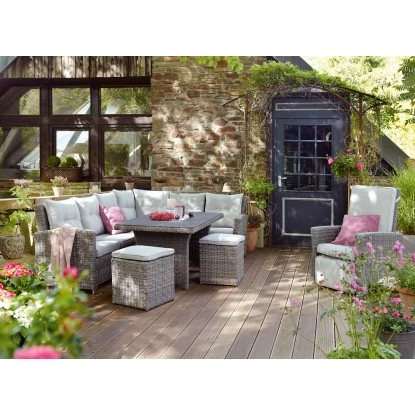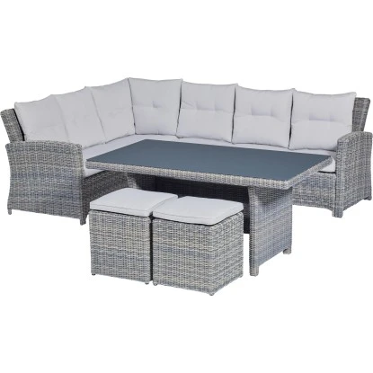 Das 5-teilige Lounge-Set mit Esstisch der Serie Vermont mit einer Eckbank links lädt zum Relaxen und gemütlichen Beisammensitzen ein. Die Gartenmöbelgruppe besticht durch ihr hochwertiges Material, ihren extra Komfort und ihr stilvolles Design. Dank der cleveren Kombination aus Lounge- und Esstisch-Gruppe eignet sie sich sowohl zum entspannten Verweilen in Ihrem Garten als auch für einen gemeinsamen Grillabend in größerer Runde. Denn Sitzbänke besitzen die praktische Eigenschaft, viel Sitzfläche mit wenig Möbeln zu bieten. Die beiden handlichen Hocker sind flexibel arrangierbar. An dieser Rattangarnitur können bis zu sieben Personen Platz finden. Auch können Sie einen weiteren Gartensessel der Serie Vermont ergänzen (nicht im Lieferumfang enthalten). Zudem verfügt der Tisch über eine angenehme Höhe und ist mit einer pflegeleichten Glasplatte in Grau ausgestattet.